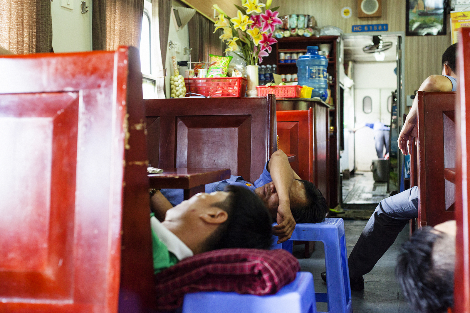 We looked for an empty seat in the dining cart, but all the workers were lying across the battered wooden benches, their legs bunched up in the air, hands or hats casually thrown across their eyes, blocking out the sun that cascaded through the dirty windows. We found an empty booth at the back of the cart, and listened to the soft snores and clinking of half filled spirit bottles with peeling labels, knocking against each other behind the skinny island bar. The chef banged some pots together, preparing our order in a filthy grey kitchen through a broken door, as the train rolled through the green paddy fields and small villages which had grown up with the weeds around the edge of the track. Stringy noodles rhythmically swayed in the chipped china bowls, and for the first time on the trip, I actually felt quite peaceful; all the madness was on the other side of the window, and for a few hours I could be a just be a spectator.